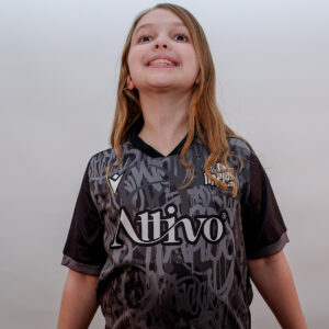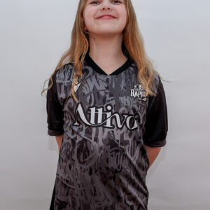 The shirt to be worn by the reigning champions of the competition features custom graphics consisting of overlapping graffiti-style lettering in various shades of grey on a black background. The V-neck and shoulders are totally black, with the sleeve edges featuring a dark grey band.