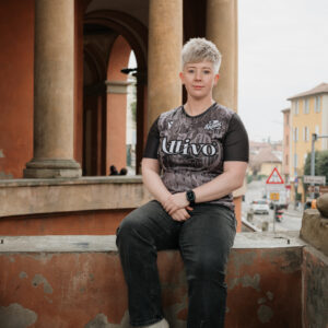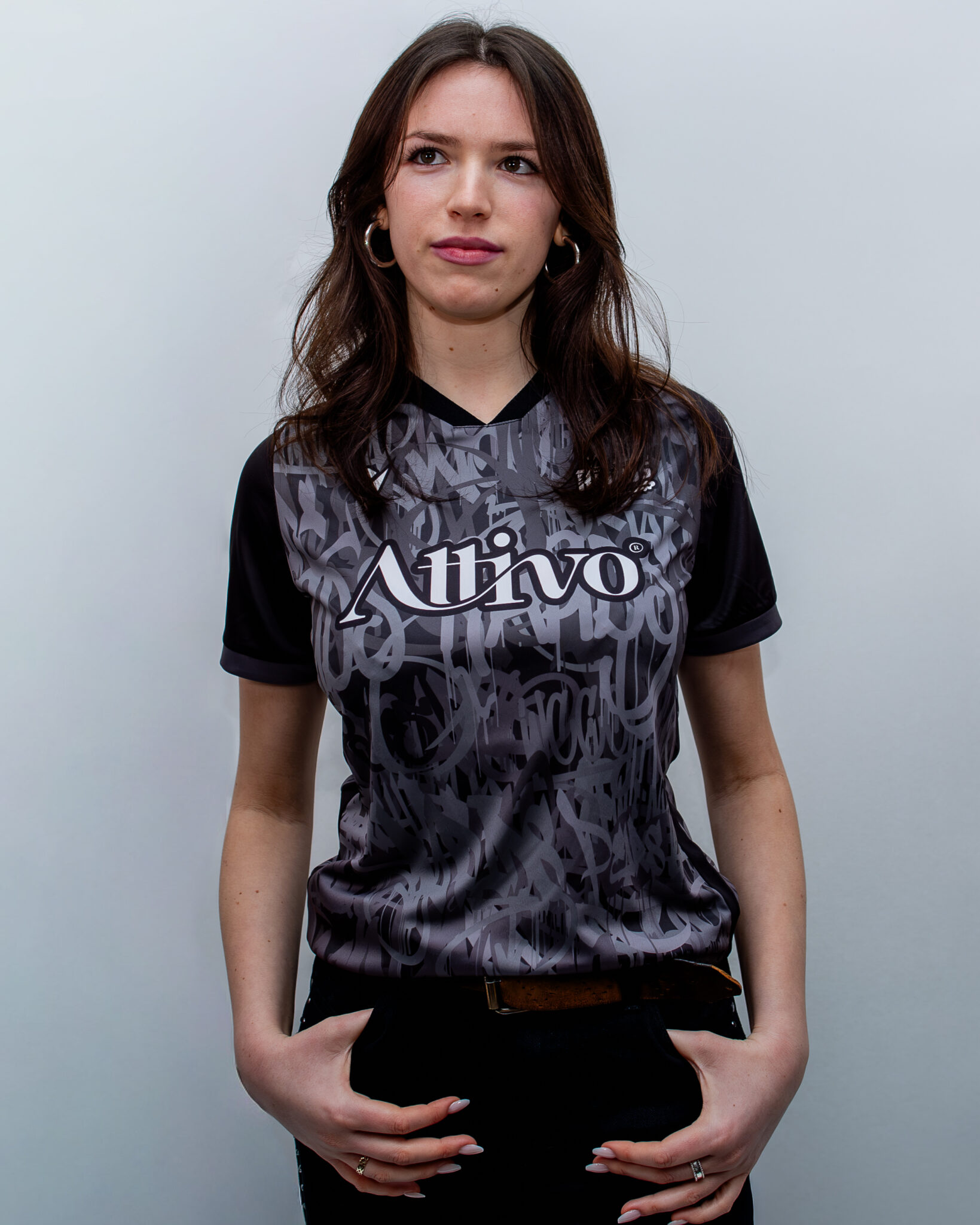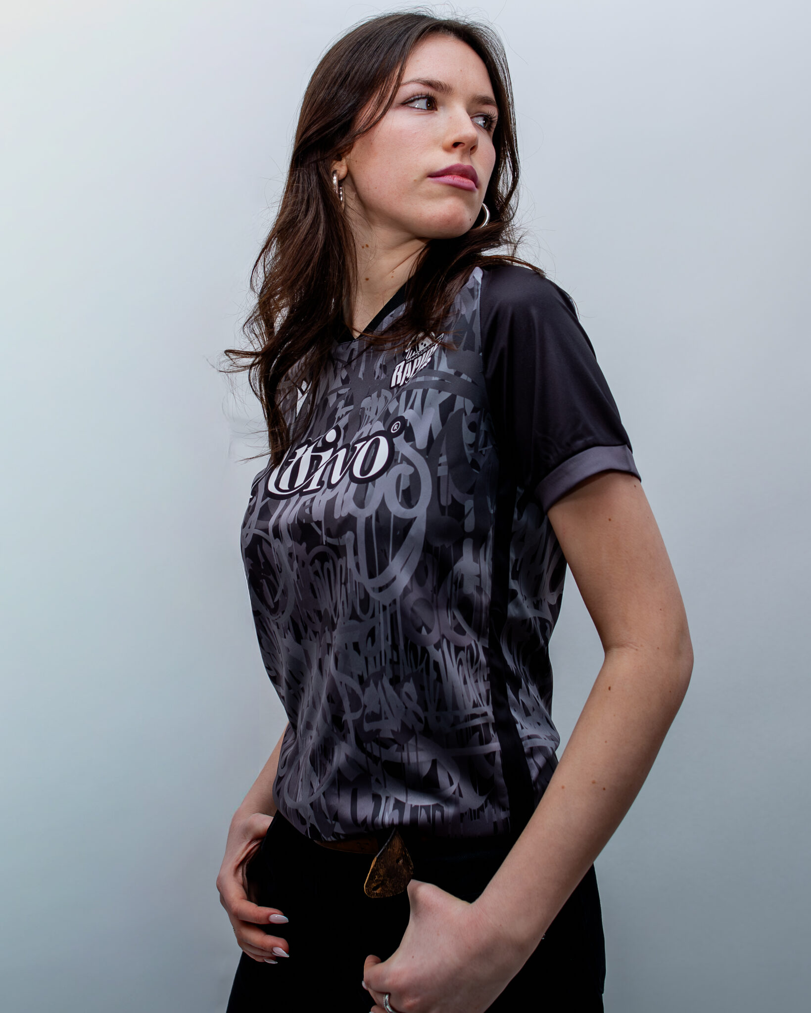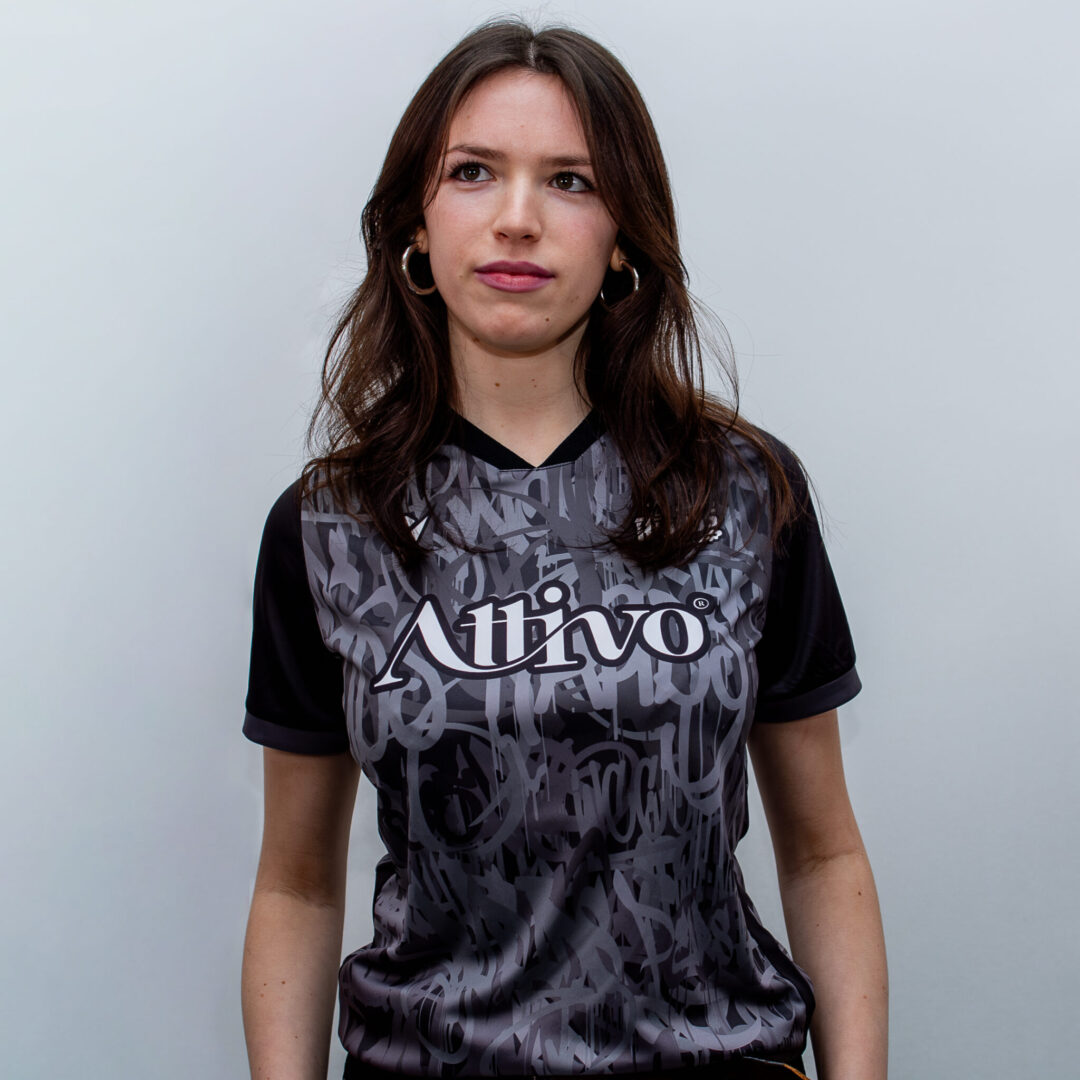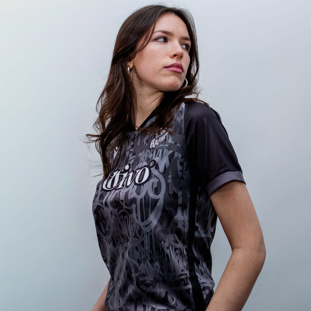 The shirt of the reigning men’s competition champions is designed with custom graphics that consist of overlapping graffiti-style lettering in various shades of grey on a black background. The round neck and shoulders are entirely black, with the sleeve edges featuring a dark grey band.