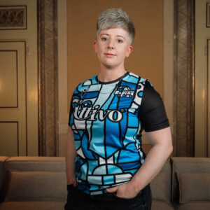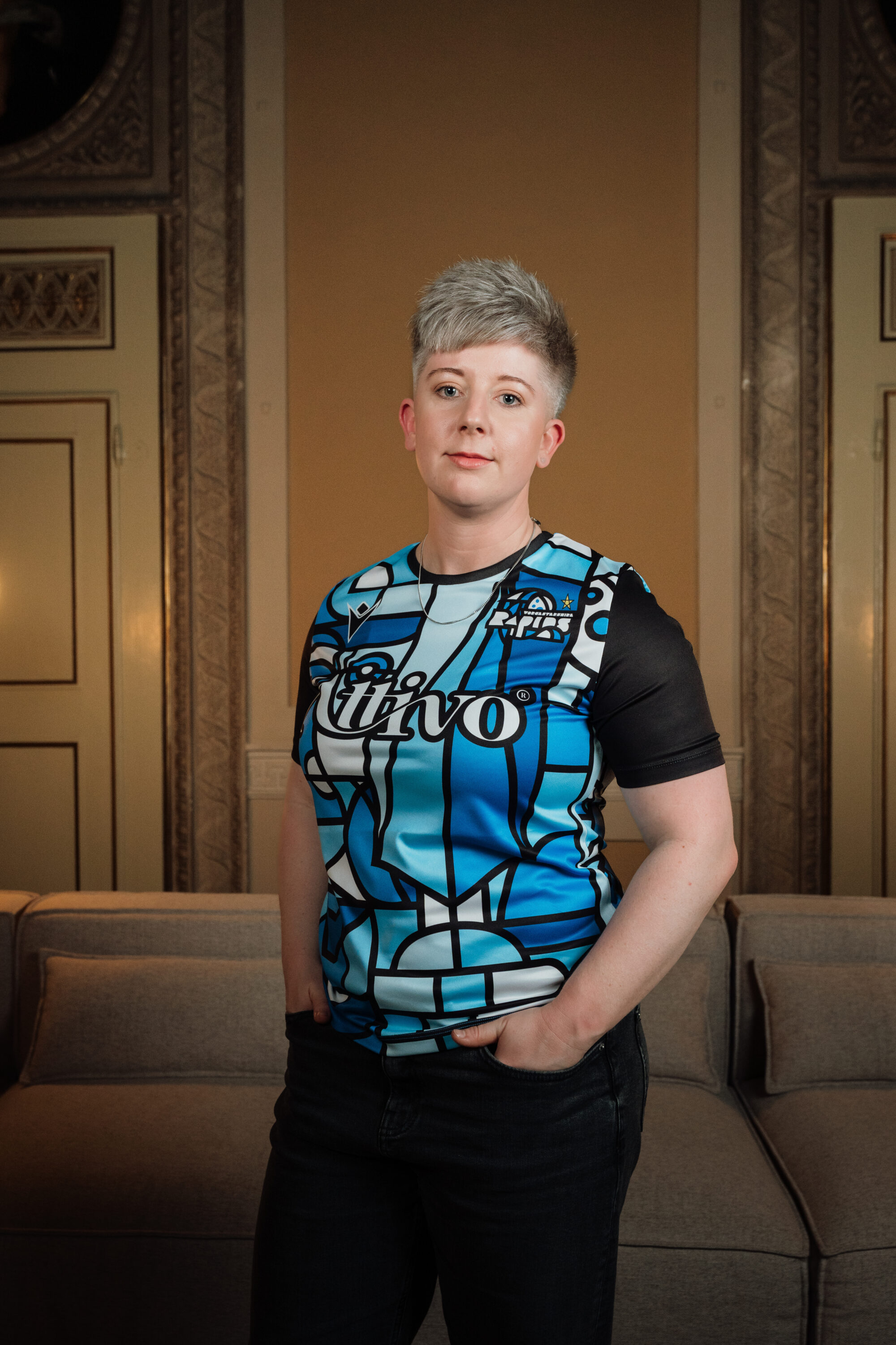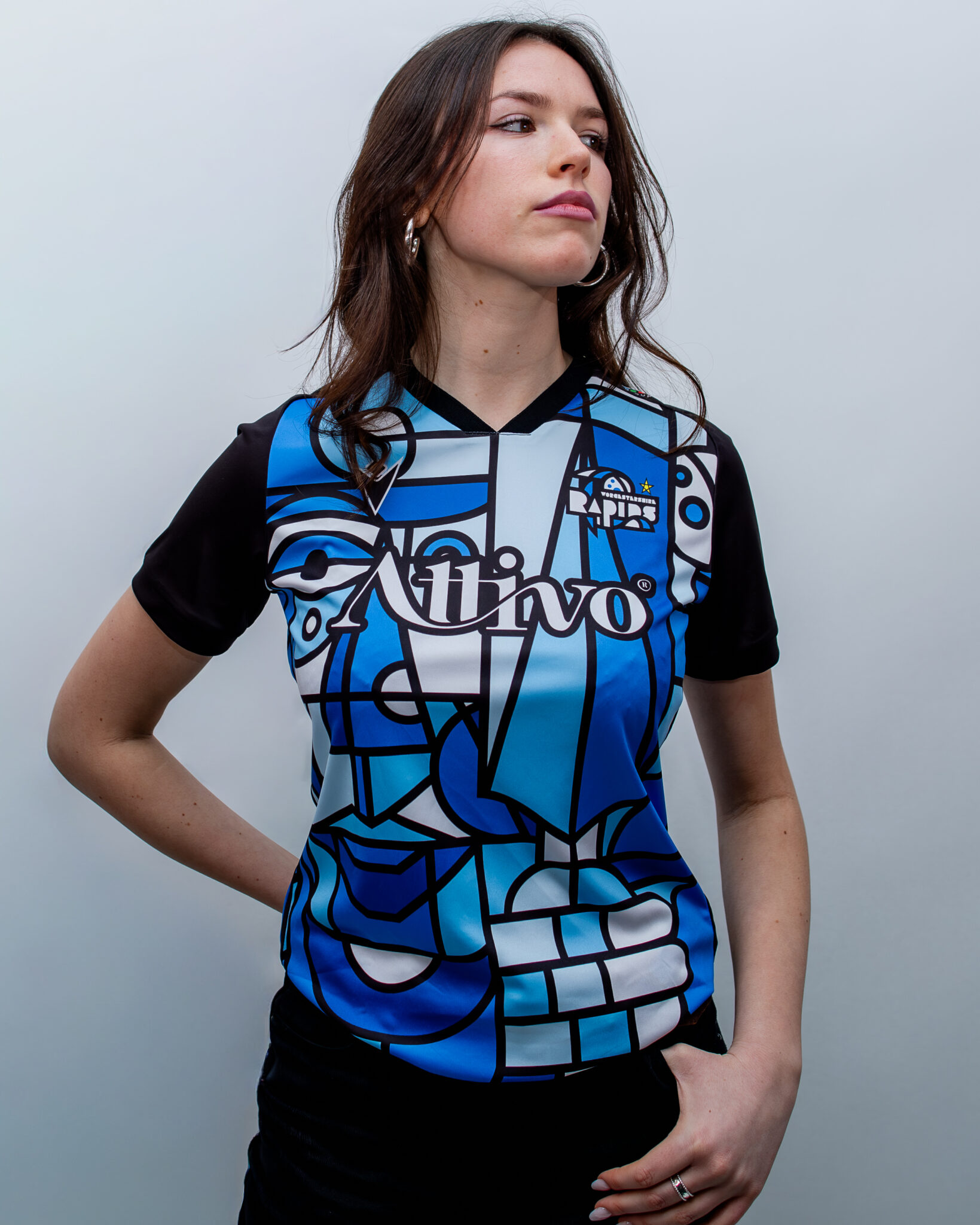 It has a slim fit designed specifically for female athletes and is made from Eco Gotex, a fabric composed of 100% post-consumer recycled plastic, which guarantees perfect lightness and comfort. On the left side of the chest is a cubist-style version of the Worcestershire Rapids crest and on the right side is the Macron logo in black.