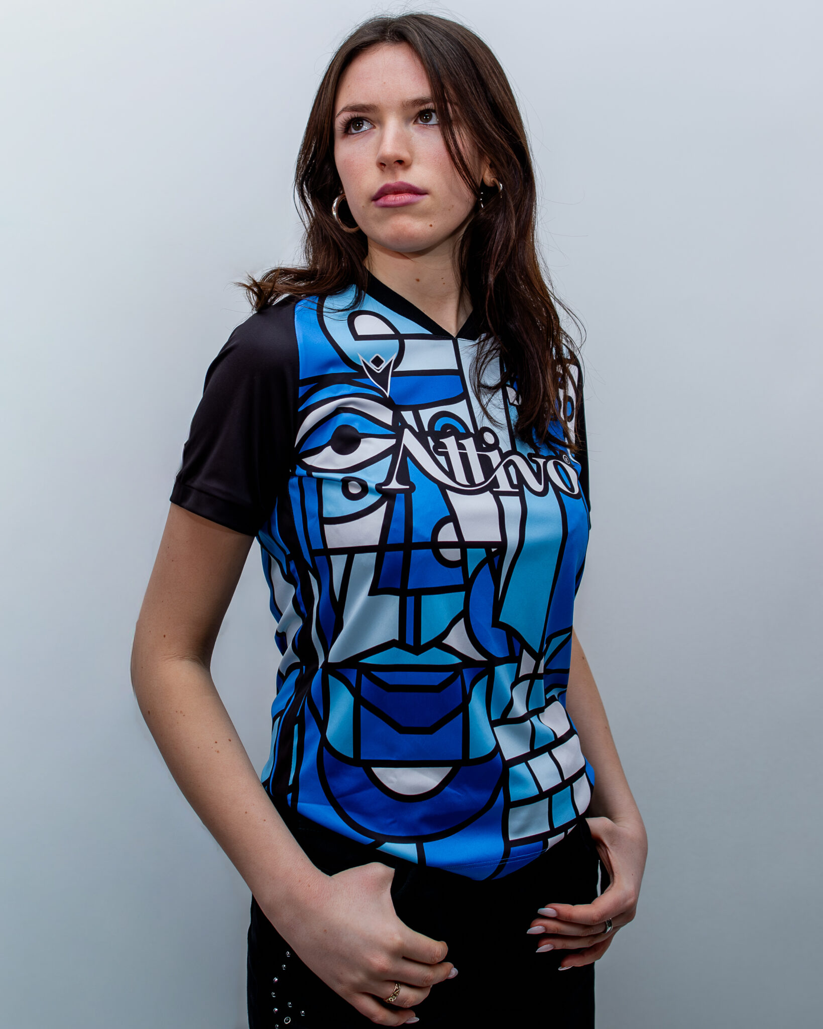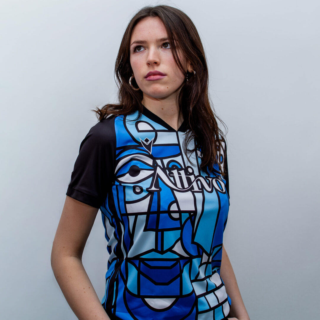 With a customised graphic design consisting of an abstract cubist-style pattern in various shades of blue and white, this shirt has a rounded neck style collar and sleeves that are entirely black.